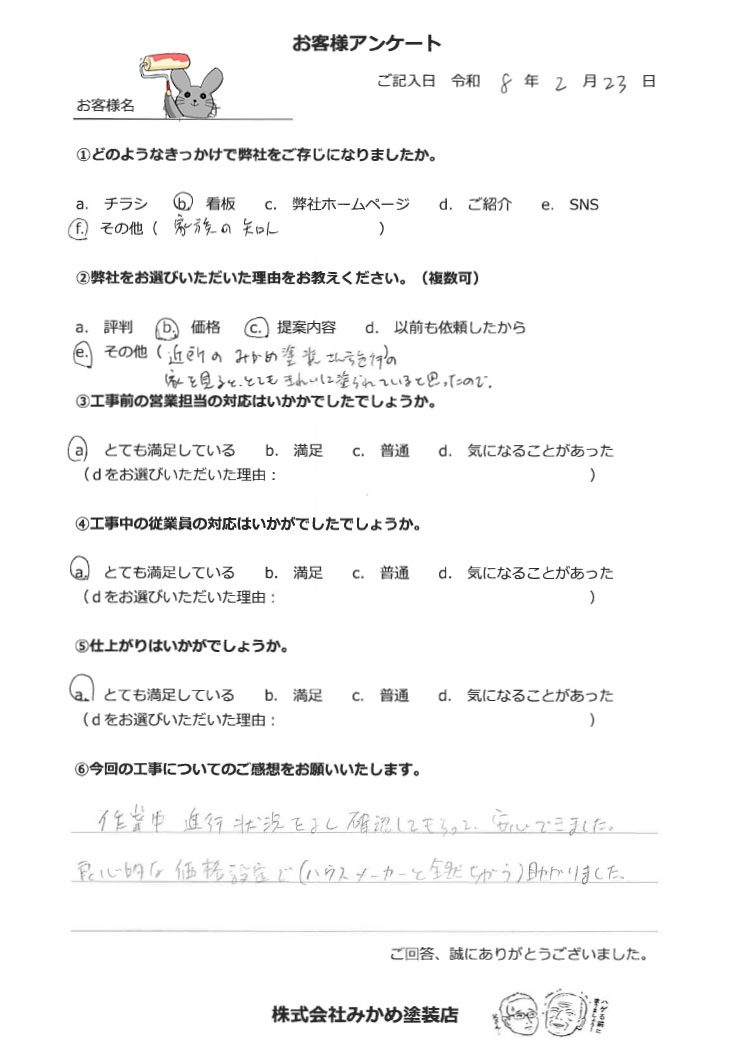 今回は、船橋市八木が谷で塗り替え工事を行ったI様からのアンケートでした。ご協力、ありがとうございました!